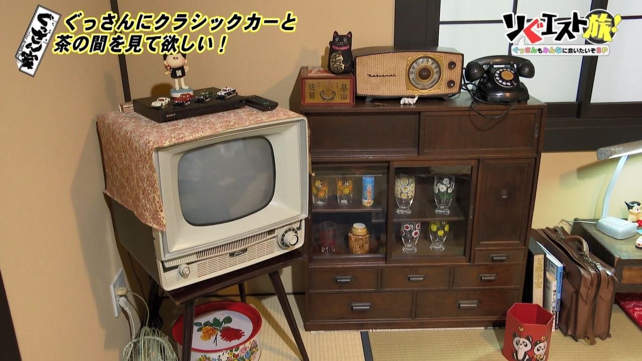 「う~わ!昭和だ。でも匂いは新しいおうちの匂い」と驚くぐっさん。レトロなテレビに茶だんす、黒電話にちゃぶ台と、昭和の時代にタイムスリップしたようなお部屋は以前の『ぐっさん家』を彷彿とさせます。