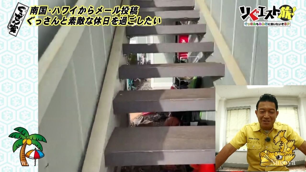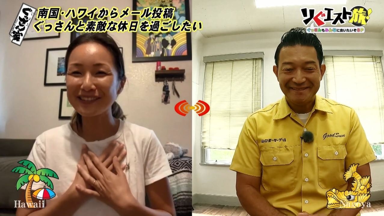 最後はなんとハワイからの“リぐエスト”。パソコンをひらくと画面にはリモートで繋がった依頼者が!「ぐっさんと素敵な日曜日を過ごしてみたい」とメールをいただいたアウリオ千恵美さん。大好きなぐっさんの顔を見るなり、感極まって涙が!