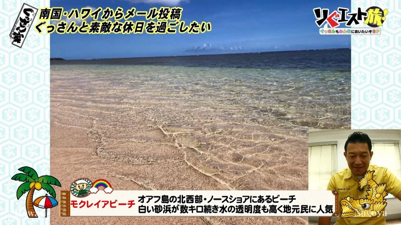 さらにハワイでの休日を楽しんでもらおうと千恵美さんが画面に映したのは美しい海の風景!オアフ島の『モクレイアビーチ』は白い砂浜が数キロ続き、水の透明度も高く、地元で大人気のスポットです。