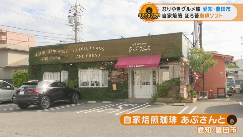 『自家焙煎珈琲 あぶさんと』は、自家焙煎の珈琲にこだわるマスターが始めた、創業40年の老舗喫茶店。自慢の珈琲を凝縮した特製ソースをたっぷりかけた、大人もはまる味の「珈琲ソフトクリーム(550円)」をいただきます。「おっ!あー!!大人なソフトクリーム」。