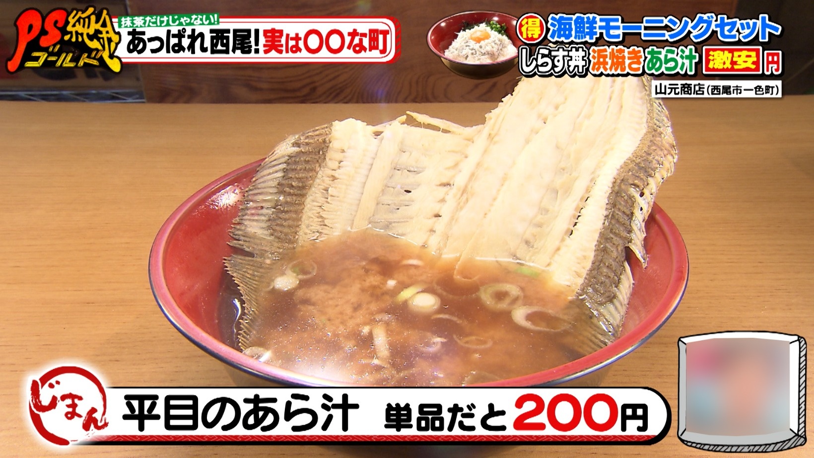 平目のあら汁(200円)は、平目1匹のあらを丸ごと入れた豪快な一品。見た目のインパクトもあり、レポーターとして店を訪れた、「キャッチ!」でおなじみ気象予報士の石橋武宜さんも「すごー!」と思わず声を上げます。