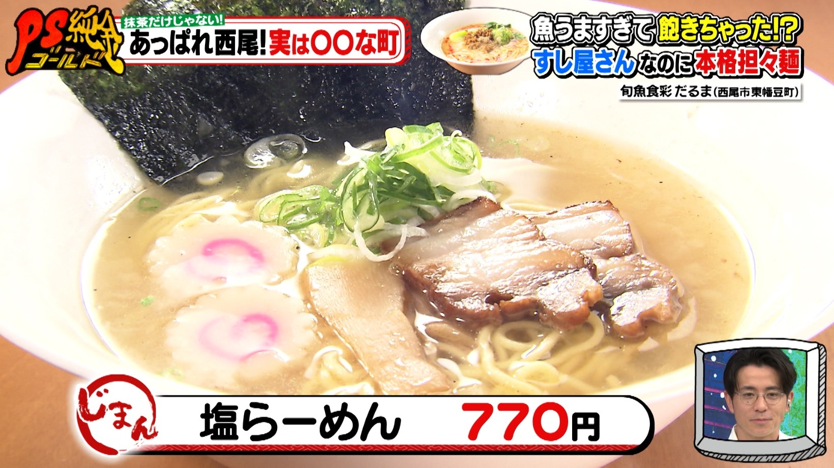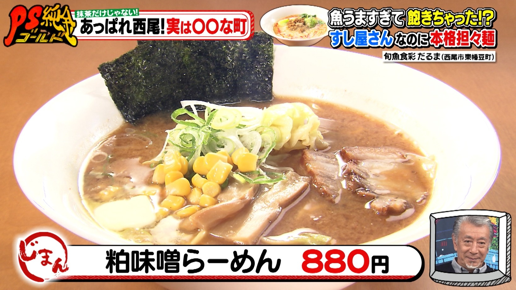 特にイチオシのメニューは「粕味噌ラーメン(880円)」で、西尾産の味噌に酒粕をブレンドした特性スープが自慢です。寿司がメインの店ですが、本格的なラーメンも楽しめるのでした。