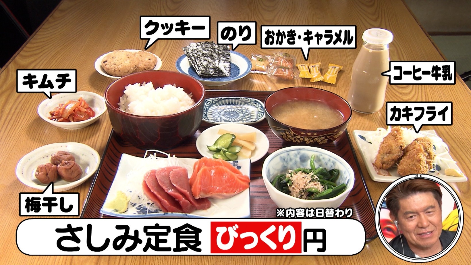 『さのさ食堂』の人気メニューは、日替わりの「さしみ定食」です。定食を頼んだだけのはずが、野菜炒めやカキフライなどのサービスも付いて800円という安さ!さらに、店のママは「飲めよオラ!」と強引気味にお酒をサービスしてくれます。