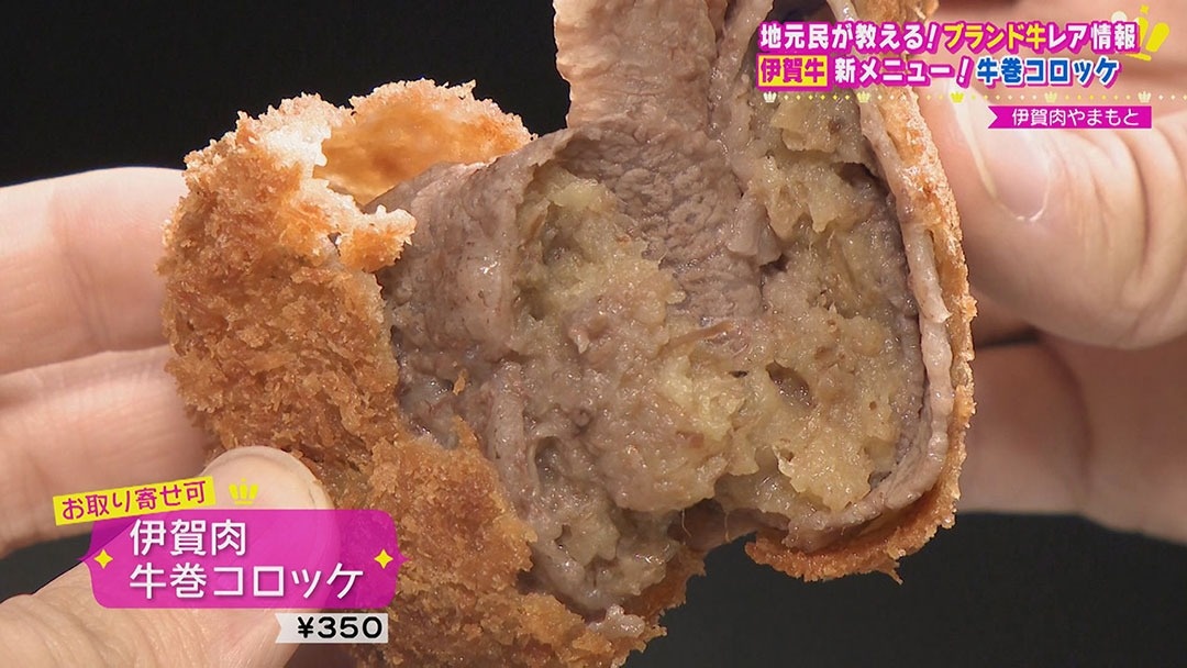 はるばる遠方から買いに来るお客さんもいるほど人気のミンコロに、新メニューとして『伊賀肉 牛巻コロッケ』(350円)が登場! 伊賀肉コロッケのタネを伊賀牛のバラ肉で巻いた商品で、通常のミンコロより伊賀肉の美味しさをダイレクトに感じられます。