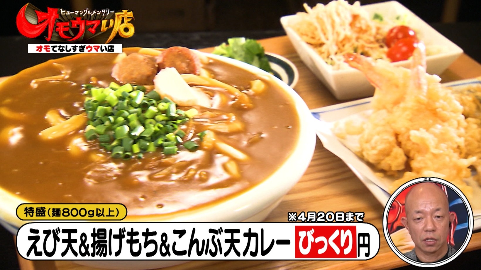 「えび天&揚げもち&こんぶ天カレー(1,520円)※2022年4月20日まで」は、トッピング盛りだくさんなカレーうどん。ボリューム満点のうどんに、スタジオからは歓声が上がります。
