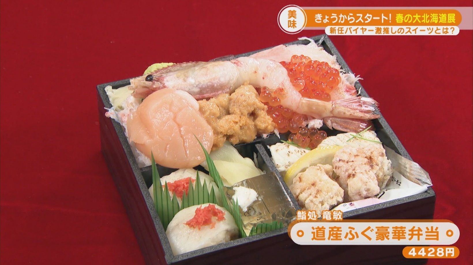 北海道物産展といえば欠かせないのが海鮮!これでもかとネタがのった贅沢なお弁当の数々です。北海道のフグを、から揚げ、炙り寿司など4つの調理法で詰め込んだ豪華なお弁当も登場。板前さんが目の前で握ってくれるお寿司の盛り合わせ、揚げたてのザンギなど、魅力的な商品が目白押しです。