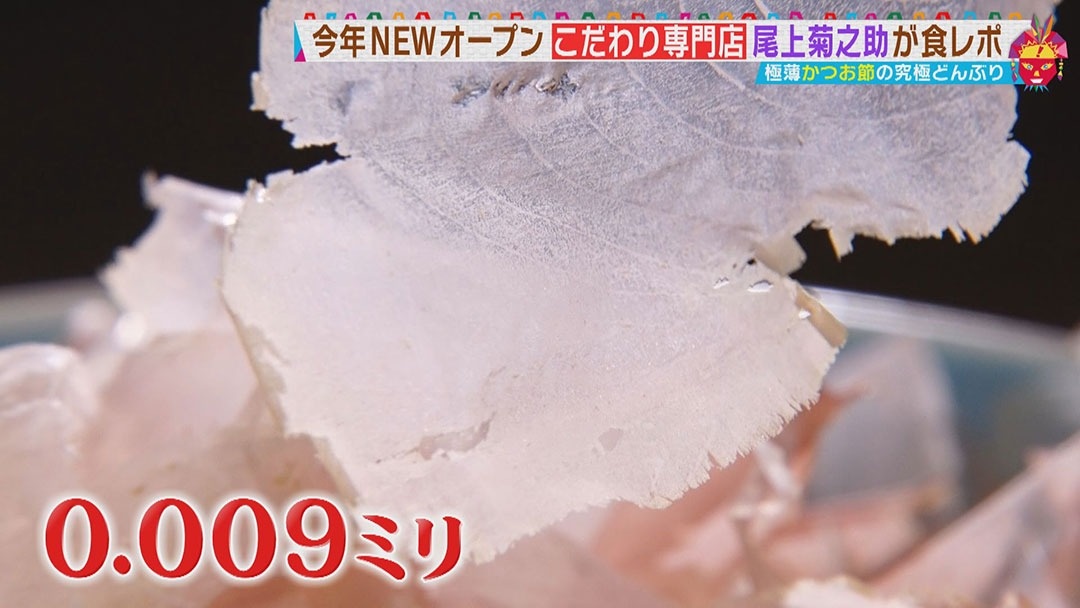 市販されている薄削りのかつお節が0.1ミリほどなのに対し、こちらのお店では極限まで薄く削り、なんと0.009ミリという薄さ! ふわっと宙を舞うほど超薄削りされたかつお節が、究極の口溶けを実現しています。