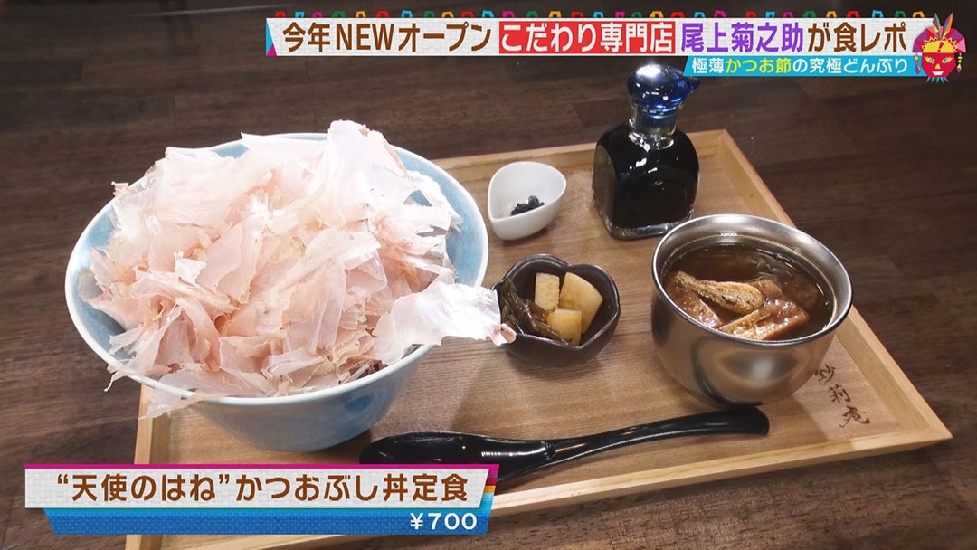 そんな極薄のかつお節を使った1番人気のメニューは、『“天使のはね"かつおぶし丼定食』(700円)。こだわりのお米の上には、香り高いかつお節がたっぷり。かつお節を漬け込んだ醤油でいただく、かつお節尽くしの定食です。
