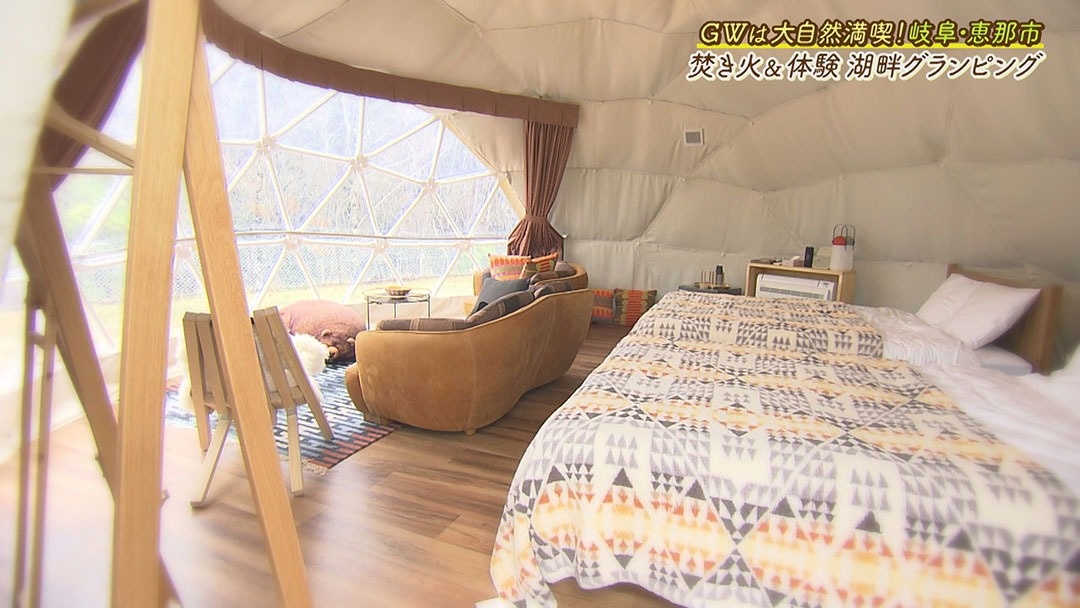 今年4月、標高900mに位置する「保古(ほこ)の湖」の隣に『根の上アウトドアパーク恵那 保古グランピング』が新しくオープン! 湖のほとりという絶好のロケーションを活かした、恵那初のグランピング施設です。