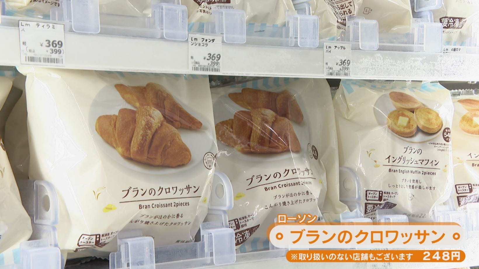 ローソンの冷凍コーナーに並ぶ『ブランのクロワッサン』。小麦の表皮「ブラン」が使われている冷凍のクロワッサンです。パン1個あたりの糖質は、なんと4.8g! ブランは低糖質で栄養価が高く、体に優しいと女性を中心に人気の商品です。こちらの商品は普通のパンコーナーに並んでおらず、冷凍販売のみ。ストックできるのが最大のポイントです。
