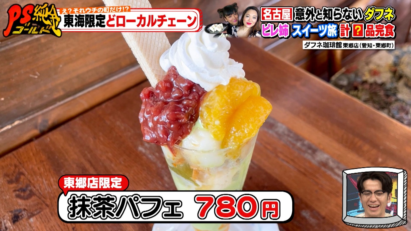 『ダフネ珈琲館 東郷店』では、店舗限定の「抹茶パフェ(780円)」を味わい、「うまい!もう一杯!」と絶賛するクリスさん。