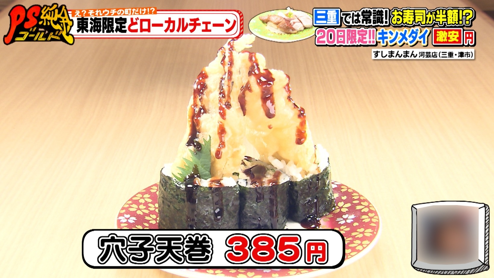 「穴子天巻 (385円)」もインパクト抜群!スタジオメンバーも興味津々です。