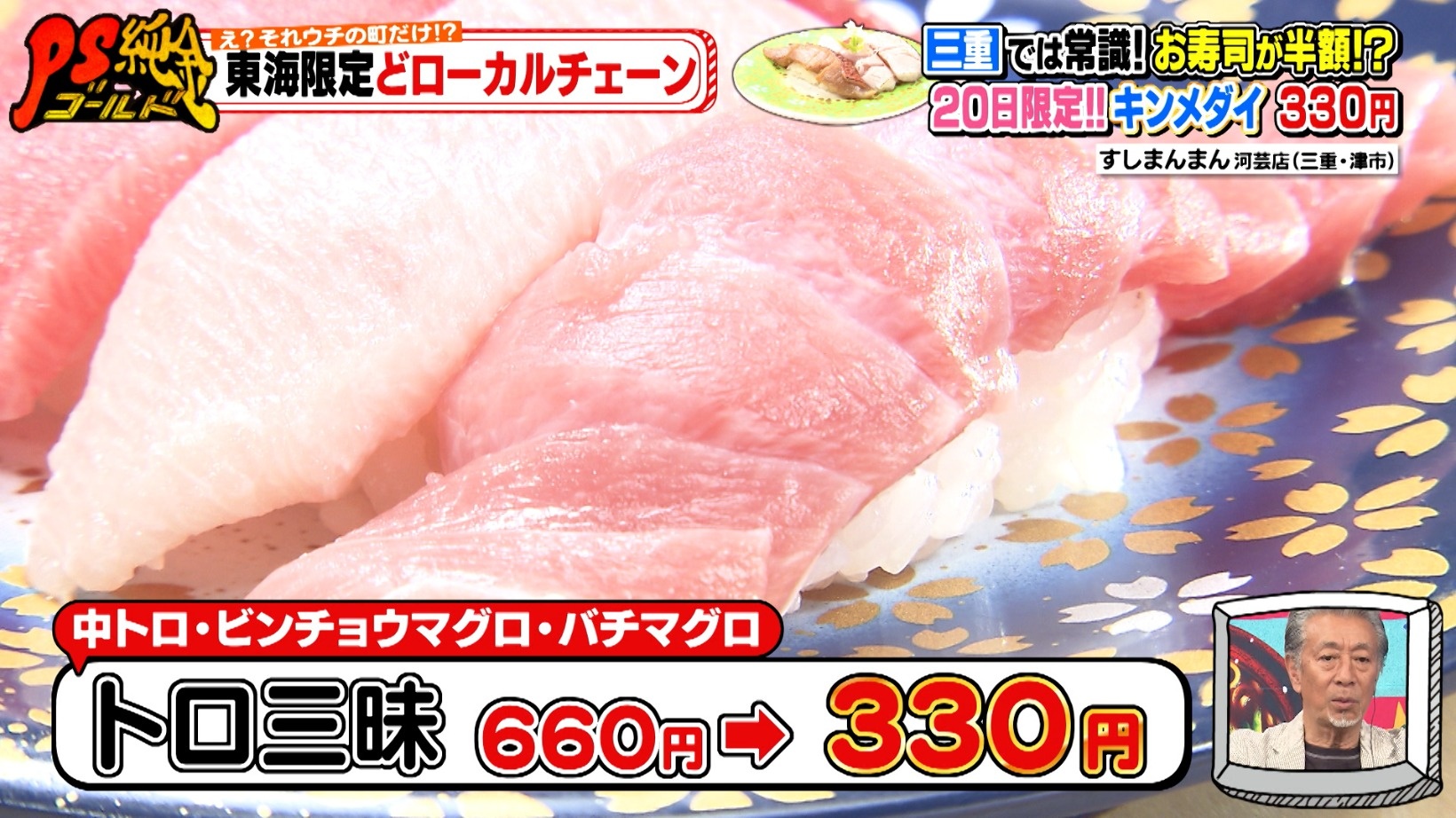 毎月20日はお客様感謝セールが行われており、いつもより寿司がお得に味わえます。「トロ三昧」は通常660円のところ、330円と半額に!これには高田さんも、「『20日はココ!』って決めてるやつ多いんだろうな」とコメントするのでした。