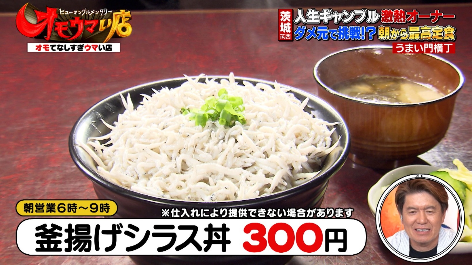 『うまい門横丁』は朝早くから営業しているそう。朝のみ提供している「釜揚げシラス丼」は、シラスがたっぷりで300円!あまりの安さに、スタジオからは驚きの声が上がります。