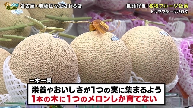 厳選された極上のフルーツにあふれる『トップフルーツ八百文』の中でもひときわ目を引くのが立派なクラウンメロン。このクラウンメロンは通常は一つの木に10個ほど生るところを間引きして1つだけにして育てたもの。栄養分が一つのメロンに集中し、極上の美味しさとなります。