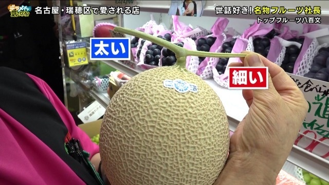 ちなみに「左右に伸びたつる茎の片方が細くなっている」ものが完熟した美味しいメロンの証。また「お尻の最後まできめ細やかな編目が入っている」ものがしっかりと身が締まって美味しいんだそうです。