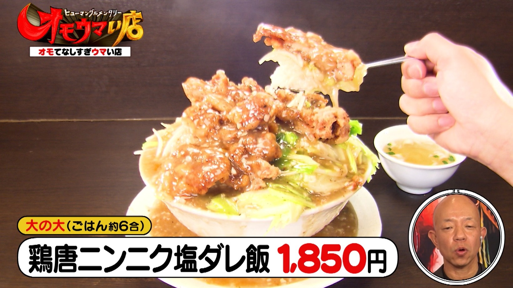 自家製塩ダレがかかった「鶏唐ニンニク塩ダレ飯(大の大)」。ご飯6合分のボリュームに、スタジオメンバーも大盛り上がり!