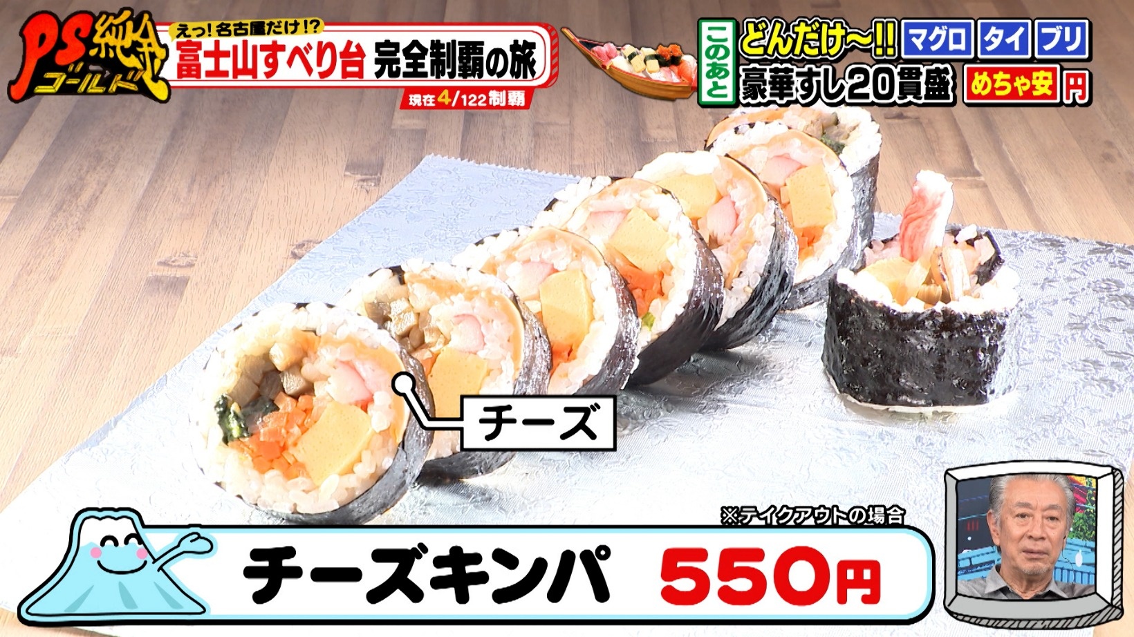 悩んだ結果、河合さんは試食していない「チーズキンパ(550円 ※)」をセレクト!濃厚なチーズを巻いたキンパの美味しさを見抜き、富士山すべり台の上で味わうのでした。