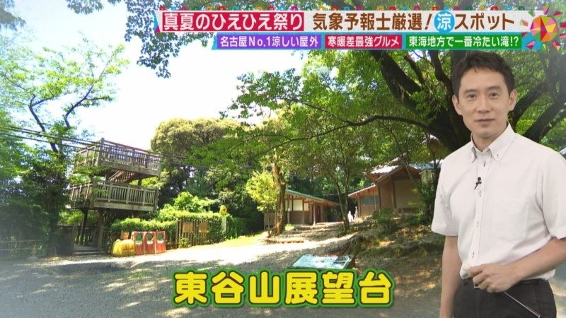 名古屋・守山区にそびえる東谷山は、標高約198mと市内で一番高い所にあります。頂上には濃尾平野が一望できる展望台があり、名古屋市内でもっとも涼しい屋外スポットだと言います。標高が100m上がるごとに気温は0.6℃ほど下がると言われており、東谷山の頂上は約1.2℃低くなるそう。実際にロケの日は、名古屋市街地より1.5℃低いことが分かりました。