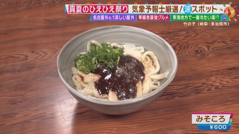 全国で40℃超えの日が一番多い多治見市では、冷たい「ころうどん」が人気。こちらのお店でも、暑い時季になるとお客さんの半数以上が「ころうどん」を注文。中でも注目なのは、味噌がベースの冷たいうどん『みそころ』(600円)。味噌煮込みうどんに使用している味噌を、冷たい麺に合うよう甘口にアレンジ。麺に味噌と青ネギを絡めていただきます。