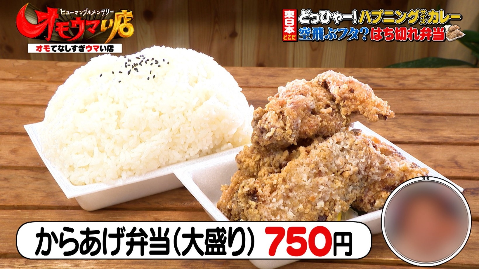 大盛りの「からあげ弁当(750円)」は容器からはみ出るほどの量です。取材中、ごはんを盛りすぎて容器のフタが飛んでしまうハプニングも!これにはスタジオでも笑いが起こります。