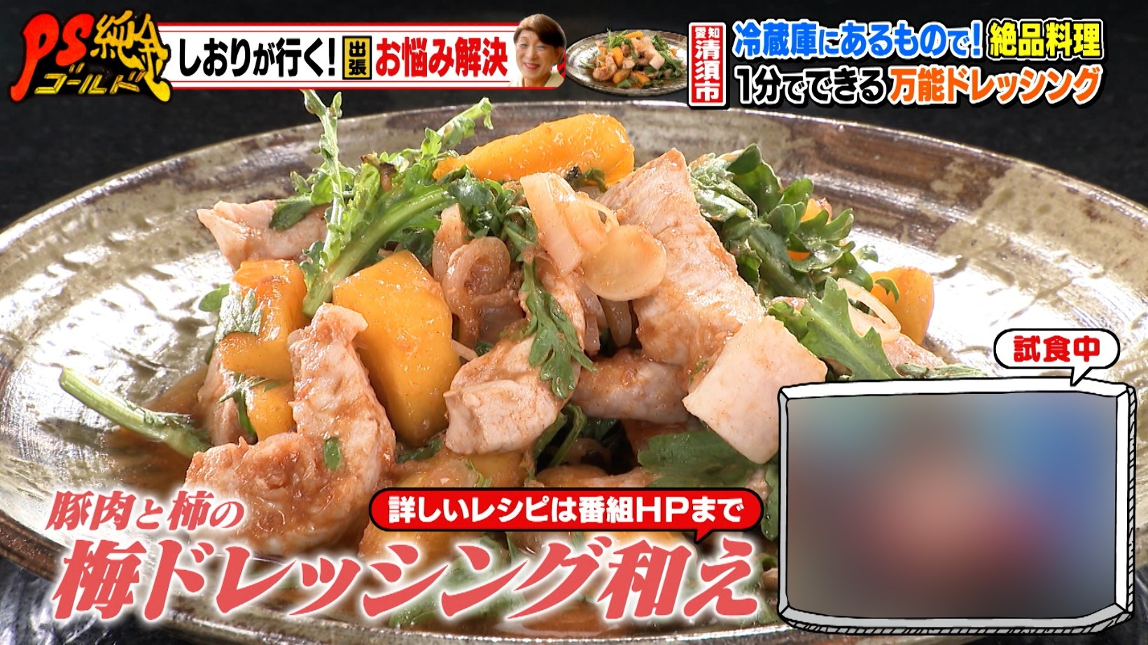 ドレッシングと冷蔵庫にあった材料をあえ、「豚肉と柿の梅ドレッシング和え」が完成!スタジオで試食した高田さんは、「柿の甘みをうまく使ってるね」と食レポします。しおりさんいわく、柿など甘みがあって香りが少ない果物は、料理にマッチするのだとか。