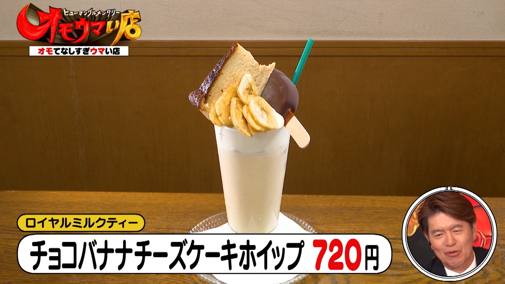 棒アイスや自家製チーズケーキをのせた「チョコバナナチーズケーキホイップ(720円)」。インパクト大の盛り付けにスタジオも驚きます。