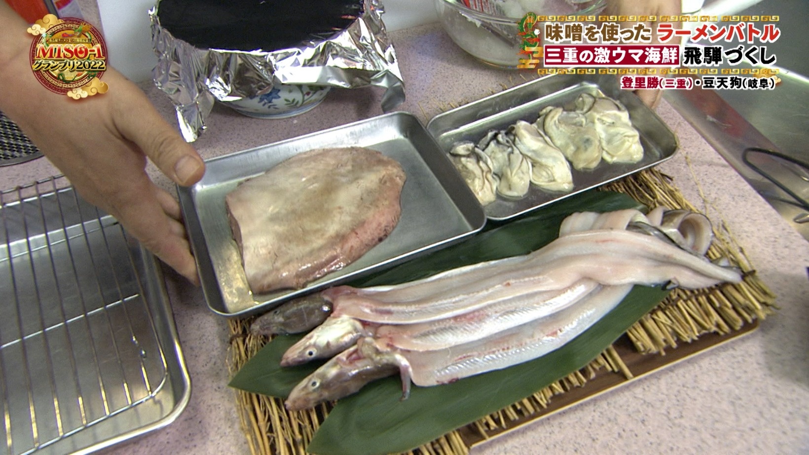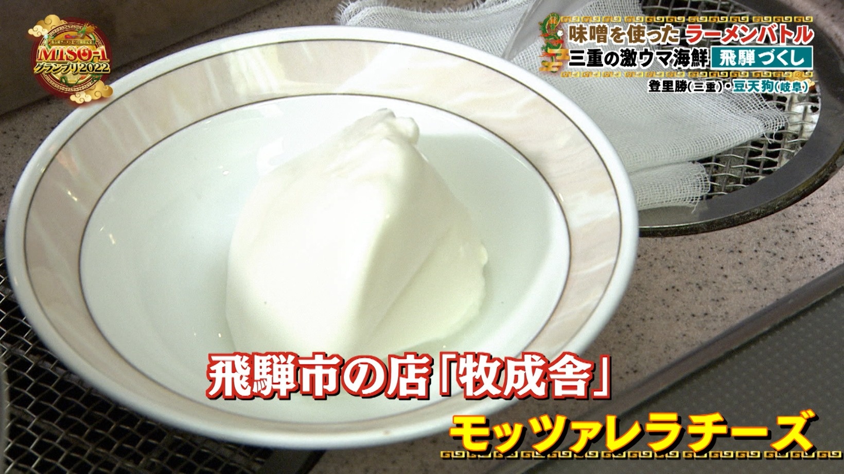 調理台で異彩を放っているのは飛騨高山地方の郷土料理・朴葉味噌。飛騨牛、飛騨ネギとともに飛騨コンロの上で焼いていきます。さらに驚き食材として登場したのは「牧成舎」のモッツァレラチーズ。味噌漬けにしていくとのことで、地元のせんべい屋「井之廣製菓舗」の味噌煎餅だけに使われる3年熟成の自家製味噌を使います。これぞ門外不出の秘伝の味噌!