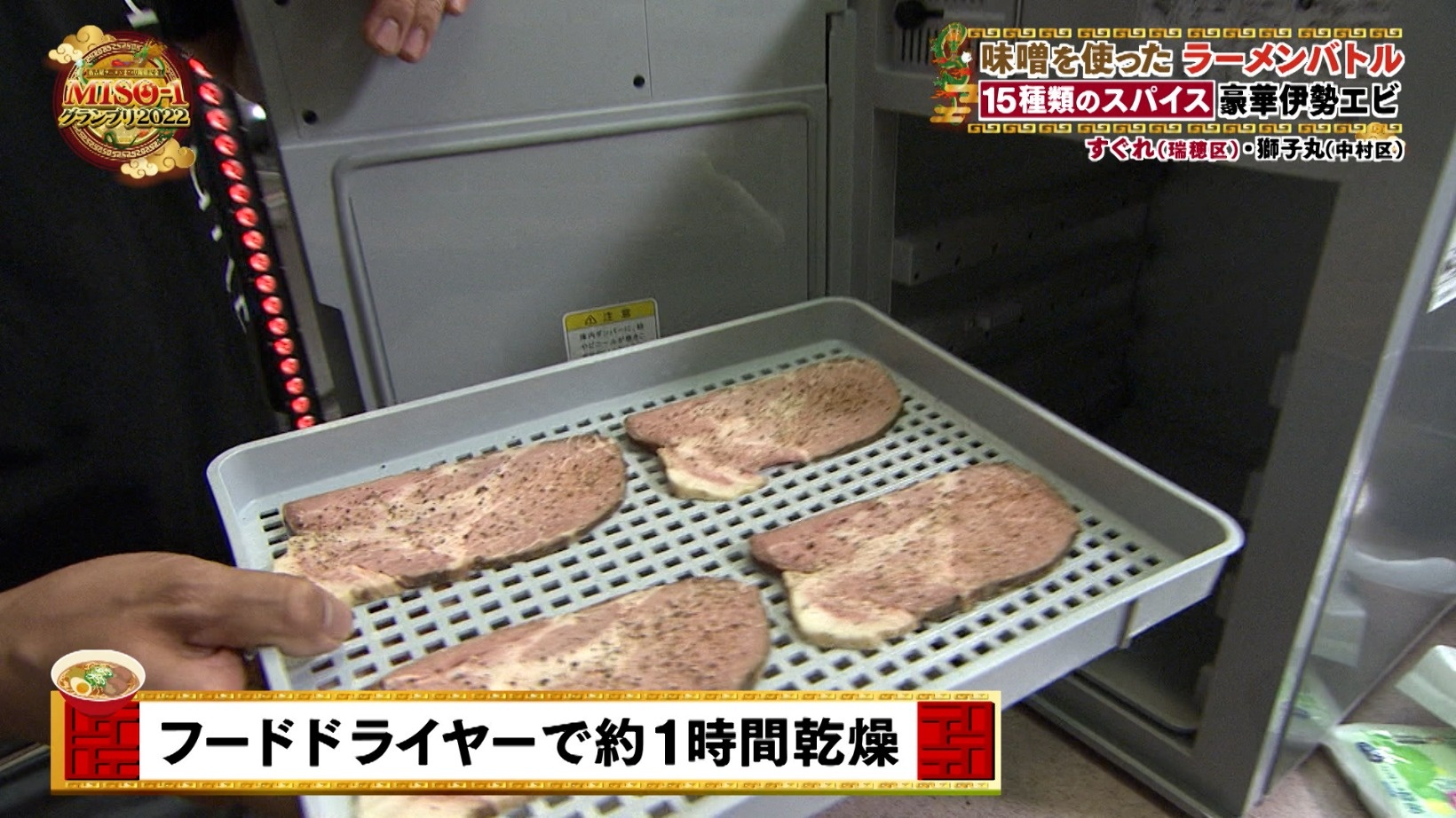 15種類ものスパイスを0.01g単位で計り混ぜ合わせていく店主。「スパイスカレーをラーメンで超えたいですね」と話し、かなりの本格派であることが伺えます。ここで肩ロースチャーシューにスパイスを振りかけ、なんとフードドライヤーへ投入。次世代のチャーシューとして、ポークジャーキーを作っていくようです。