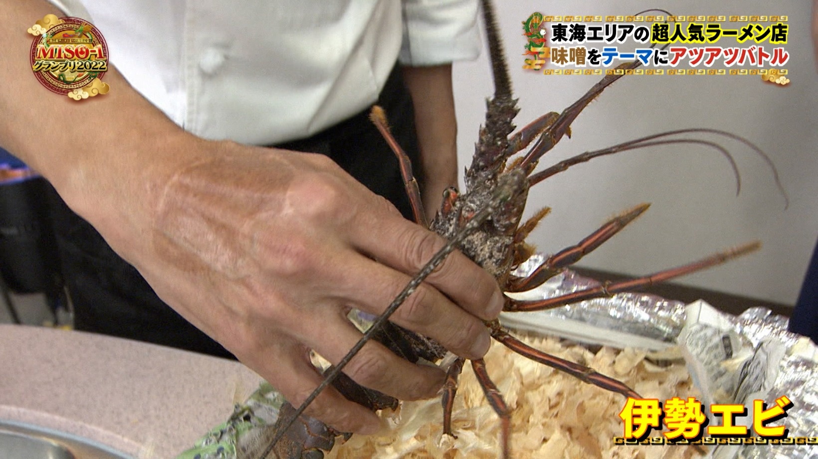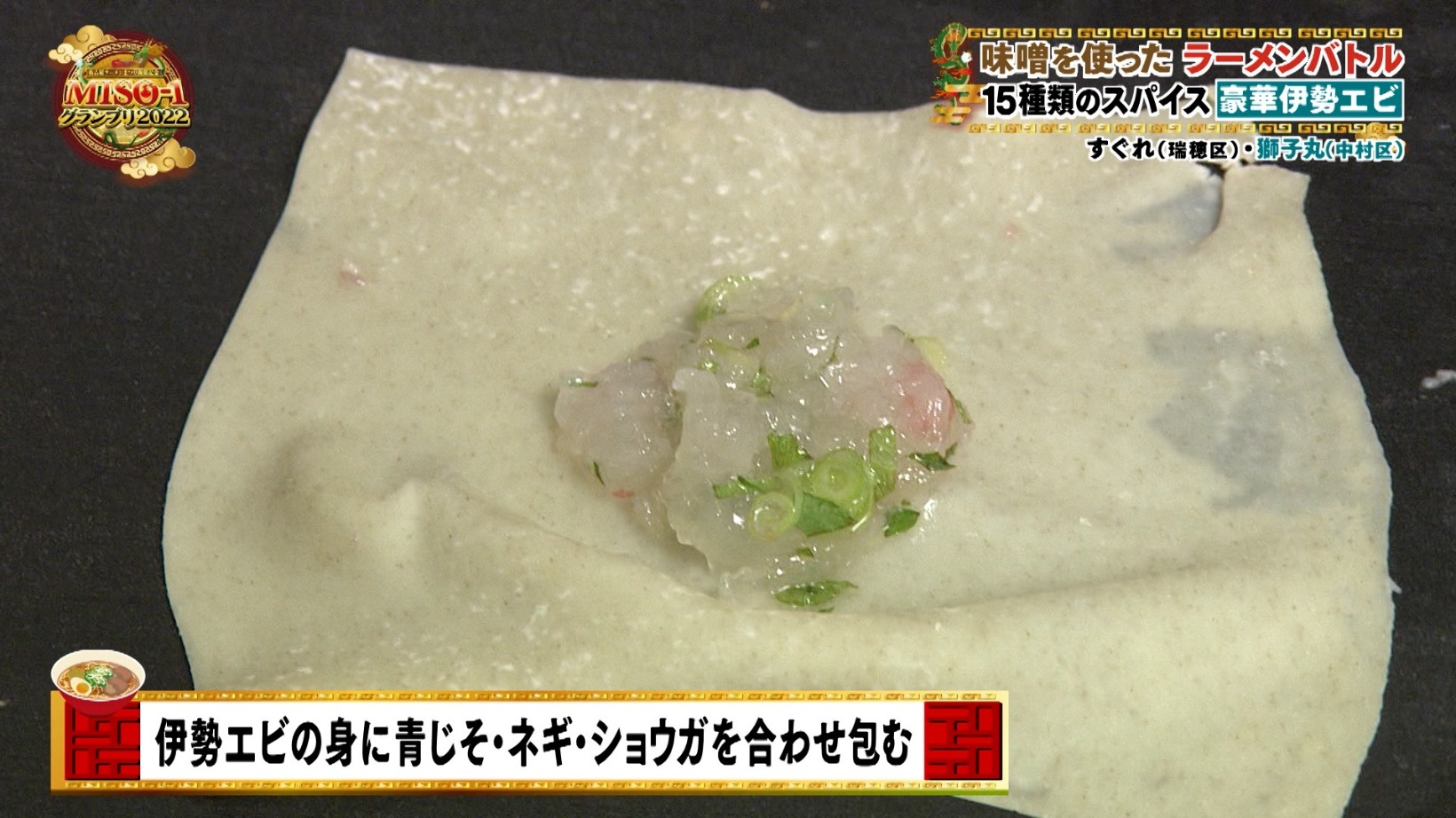調理台の上には何やら動いているモノが...その正体は伊勢エビ!豪華食材の登場にスタジオは拍手が起こるほど盛り上がりを見せます。伊勢エビの頭を使って香味油を、ぷりぷりの身を使ってワンタンを作っていきます。ワンタンの皮は北海道産の小麦で手作りしているそう。