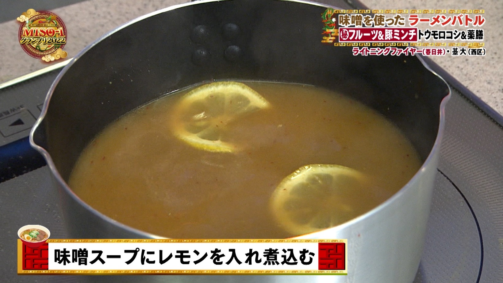 こだわりのスープは煮干しと昆布を一晩水出ししているそう。水出しすることでゆっくりと旨味が出るといいます。カツオ節も加えた黄金色のスープに味噌を入れ、さらに輪切りのレモンを入れて煮込んでいく店主。レモンの登場に「どういうこと?」とスタジオメンバーはざわつきます。