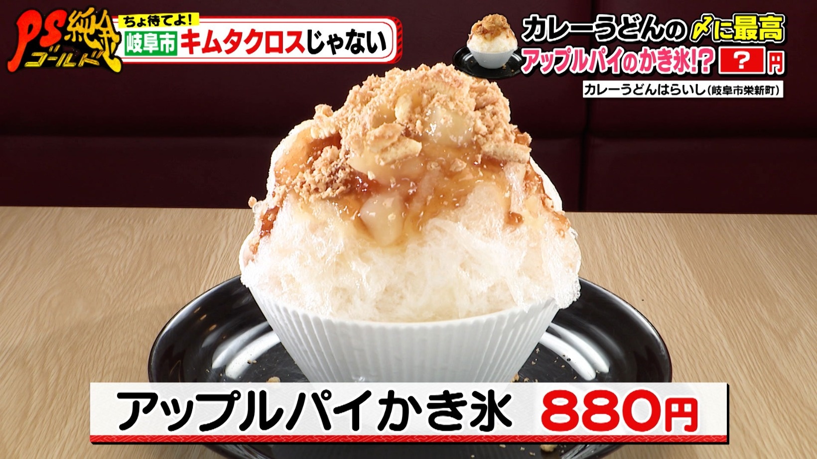 熱々カレーうどんの後にはかき氷がおすすめ。「アップルパイかき氷(880円)」は、自家製リンゴのコンポートとパイ生地が氷の上に乗せられた珍しい一品です。