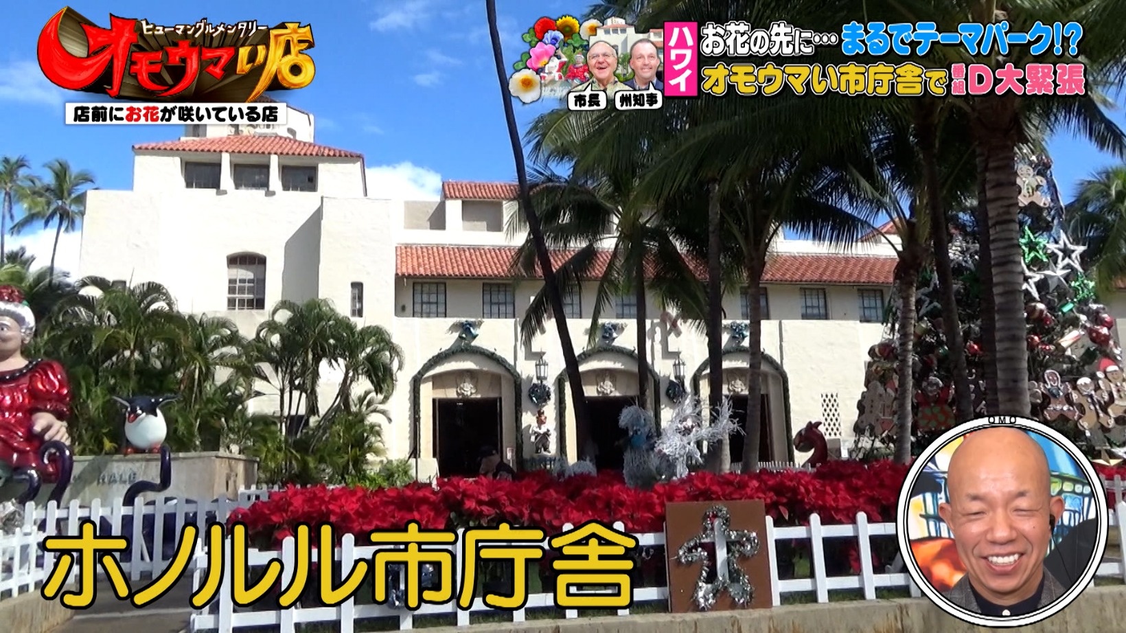 ホノルル市庁舎に飾られたお花を見て大興奮の川添D。ゲストの村山輝星さんも「豪華な市役所」とコメントします。