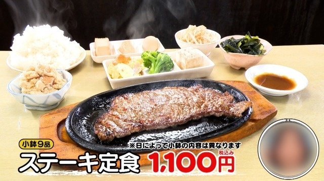 メニュー:ステーキ定食 1,100円、ステーキ定食W 2,200円 ※日によって小鉢の内容は異なります