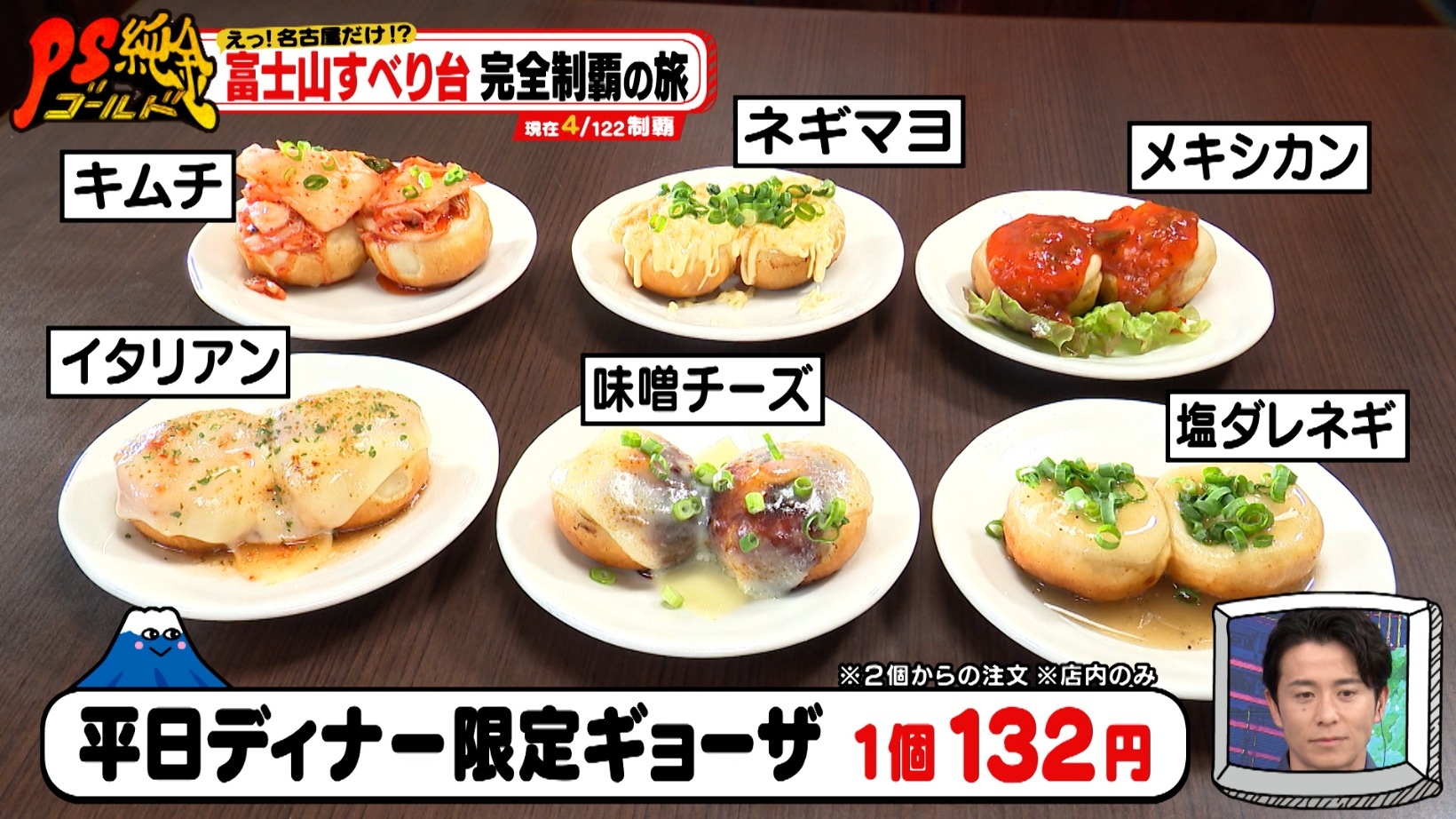 キムチやネギマヨなどでアレンジした「平日ディナー限定ギョーザ(1個 132円)」。番組スタッフが、お客さんに「チーズとギョーザは合いますか?」と質問。お客さんによると、もちもちの皮とチーズでピザのような食感になるのだとか。