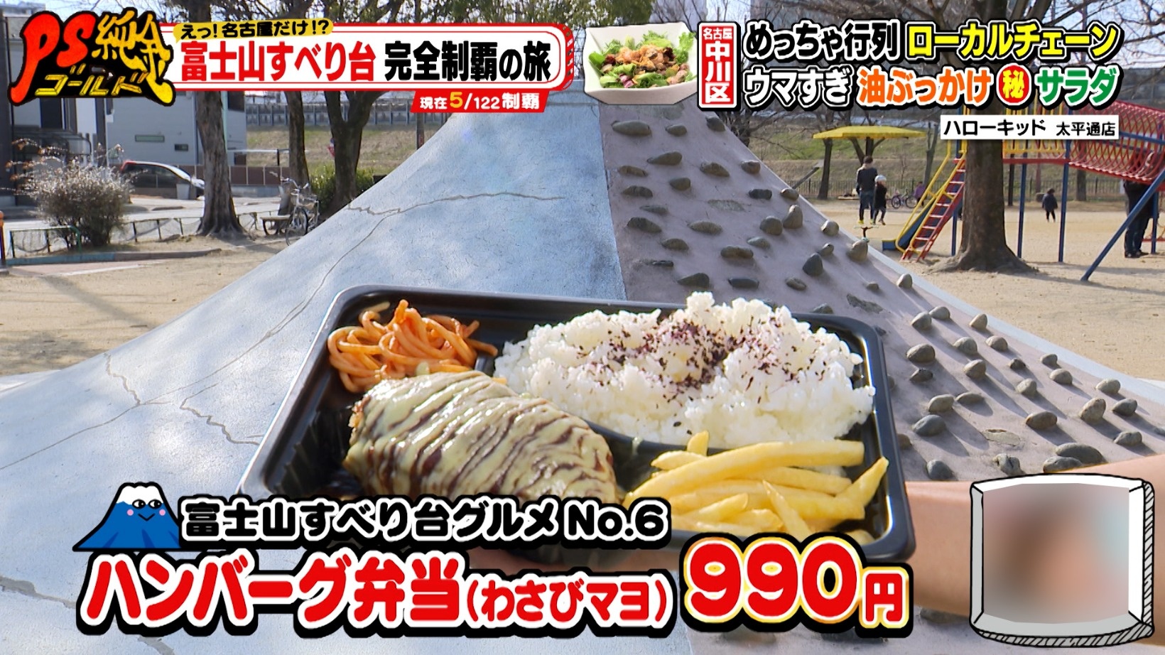 「ハンバーグ弁当(わさびマヨ・990円)」をテイクアウトし、吉良第二公園にある富士山すべり台の上で味わう番組スタッフ。すると、そのまわりに地元の子どもたちが群がり賑わいます。無表情で食べ続けるスタッフに、藤森さんは「もうちょっと楽しそうに食べろよ!」とツッコミを入れるのでした。