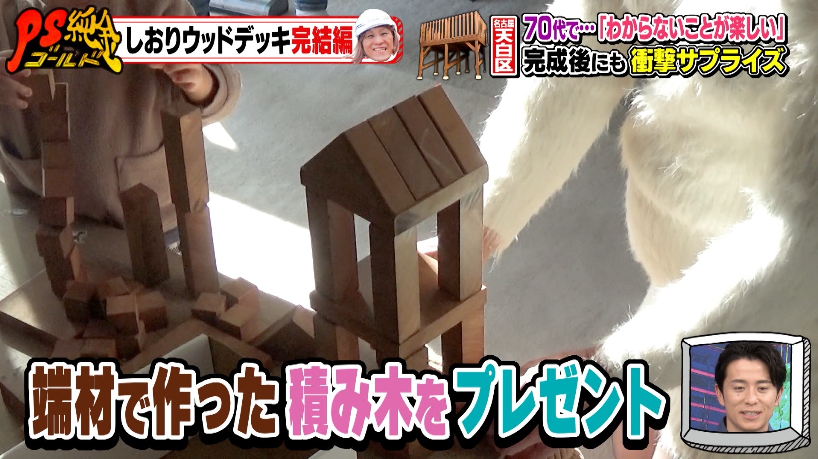 後日、再び兼山さん宅を訪れるしおりさん。木材を加工した後の端材で積み木をプレゼント!嬉しいサプライズに、スタジオから「スゴイ!」と驚きの声が上がるのでした。