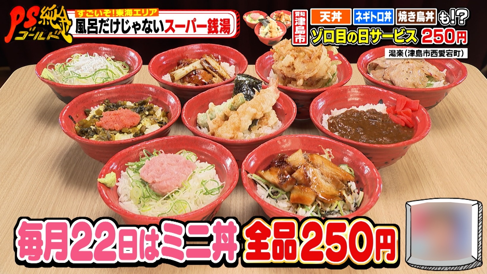 毎月22日の「ゾロ目の日サービス」は、通常450円のミニ丼が250円に!ミニ天丼・ミニねぎとろ丼などがワンコイン以下になるお得さに、辻本さんは「メチャメチャ安い!」と驚くのでした。