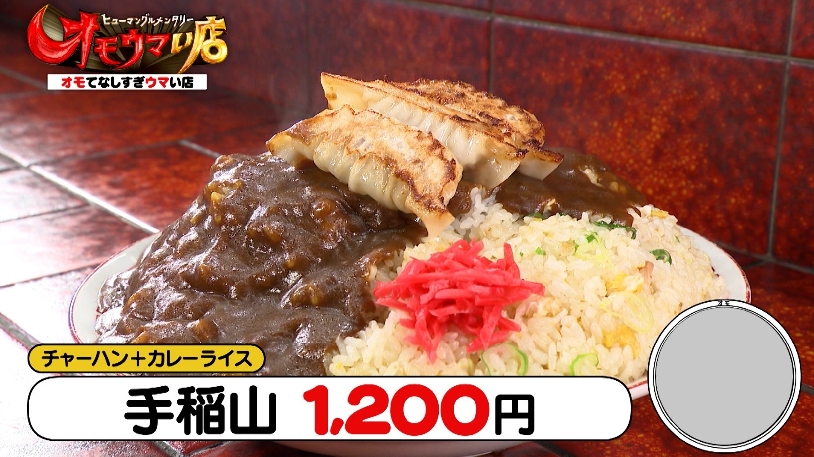 店主のおすすめ「手稲山(1,200円)」はチャーハン2合と白ごはん2合の計4合に、カレーをたっぷりかけた一品!上には餃子が乗っています。斬新な組み合わせに、「何で合わせたんだろう」とつぶやくヒロミさん。