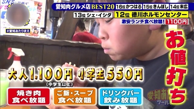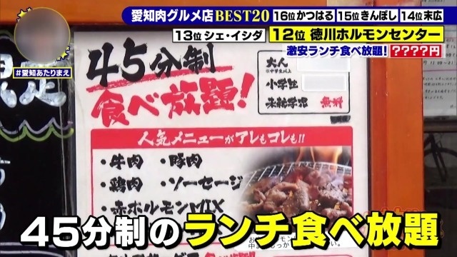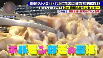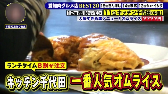 愛知は肉グルメ王国だった!?愛知県民2万人のアンケートにより選ばれた「最強肉グルメ店」を大発表! 衝撃の値段で楽しめる絶品ホルモンに元が簡単に取れすぎるお得なランチサービスで12位に選ばれたのが「徳川ホルモンセンター」。そして11位に選ばれた「キッチン千代田」ではお客さんの8割が注文するという意外な「裏メニュー」肉グルメがありました。