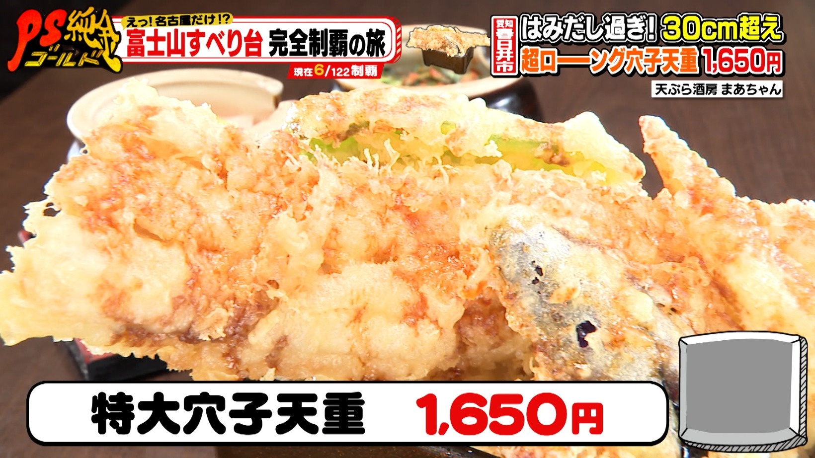 手加減知らずの店主による驚きの爆盛りメニューはまだあるそう。「特大穴子天重(1,650円)」は、30cm超えのアナゴの天ぷらが器からはみ出した豪快な一品。ゲストのスピードワゴン・井戸田潤さんは、あまりの大きさに「(池乃)めだかさんのネクタイくらいある」と笑いを誘います。