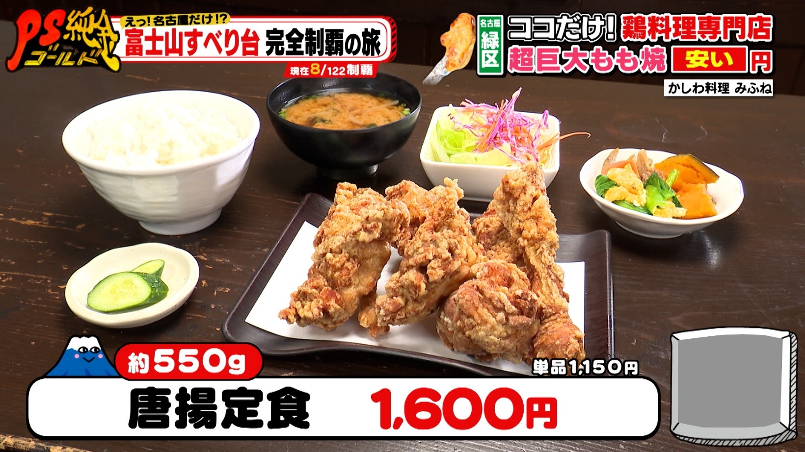 大きな唐揚げがのった「唐揚定食(1,600円)」は、常連客も太鼓判を押します!一般的な唐揚げは1個約30gなのに対し、みふねの唐揚げはなんと1個約90g。
