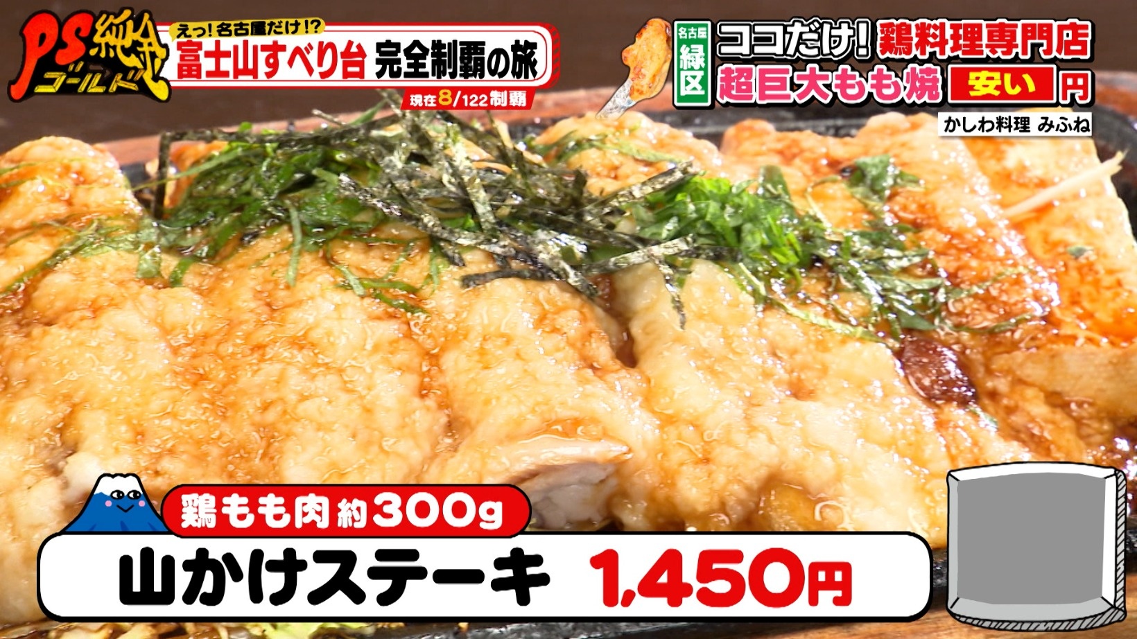 店オリジナルの鶏料理が「山かけステーキ(1,450円)」。アツアツの鉄板の上に鶏もも肉300g、その上からすりおろした山芋がかかっています。初めて見る珍しい料理に、スタジオ一同は大興奮!