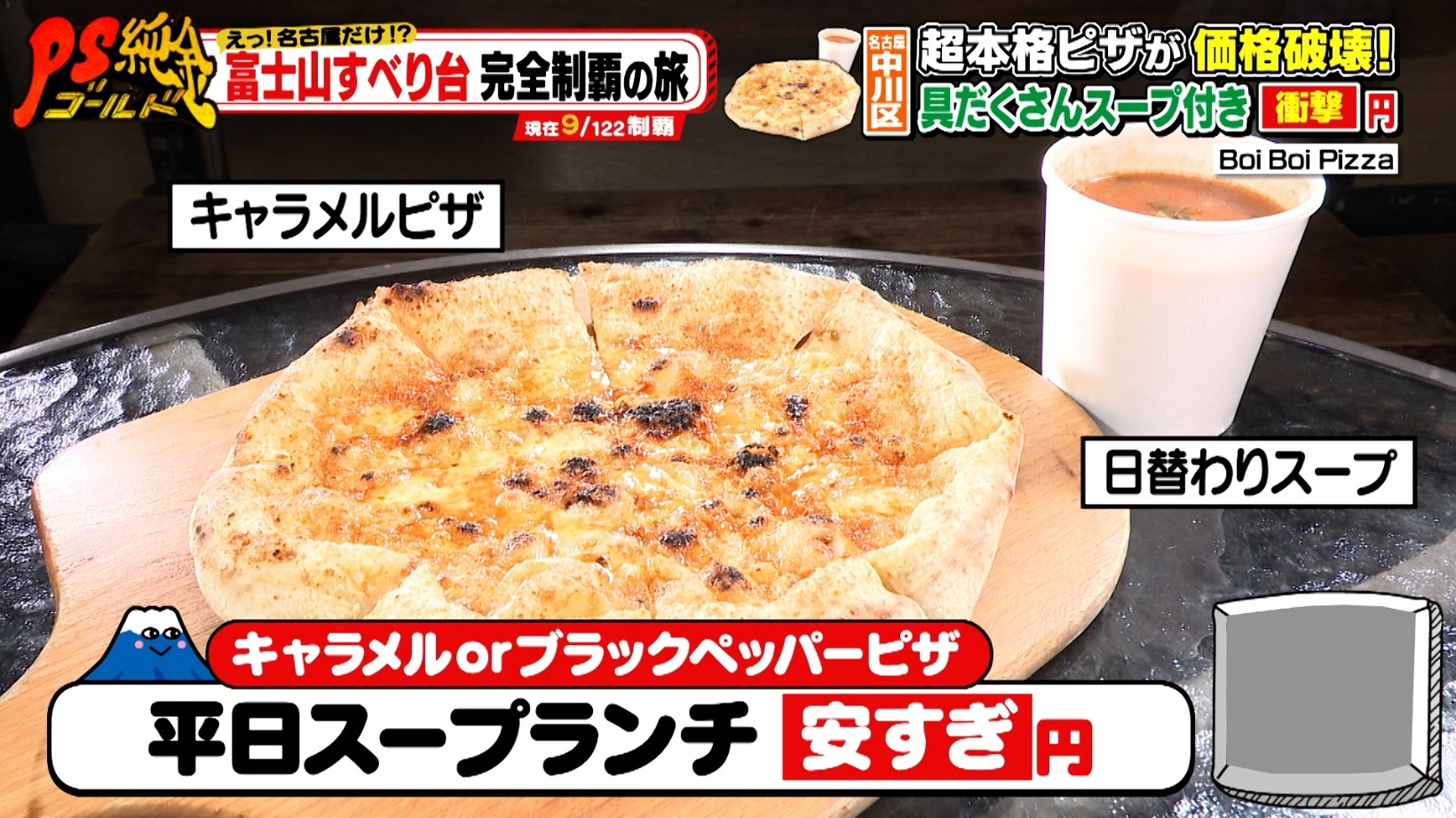 キャラメルまたはブラックペッパーピザが選べる「平日スープランチ」もおすすめ。ピザの上にかかっているのは、ドイツ・オランダ産の約5種類のミックスチーズです。