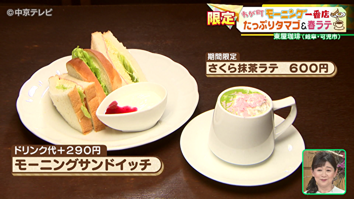 モーニングでは、さくら抹茶ラテとともにたっぷりの卵が入ったサンドイッチをいただきました。