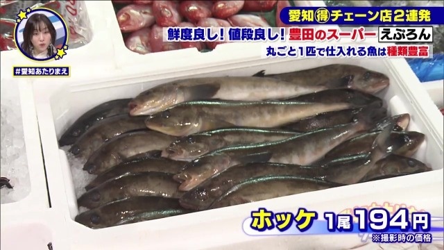 魚の種類も豊富で、タチウオやキンメダイ、さらには愛知県では珍しい「開いていないホッケ」もズラリ。どれもお値打ちで、見ているだけでワクワク感満点です。