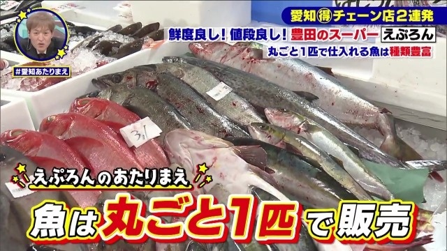 そんな「えぷろん」の目玉となっているのが鮮魚コーナー。広々とした鮮魚コーナーにはスーパーらしからぬ「丸ごと1尾」の新鮮な魚がずらーっと並んでいます。海に面していない豊田市のスーパーとは信じられないほどの充実振りです。