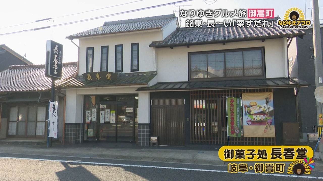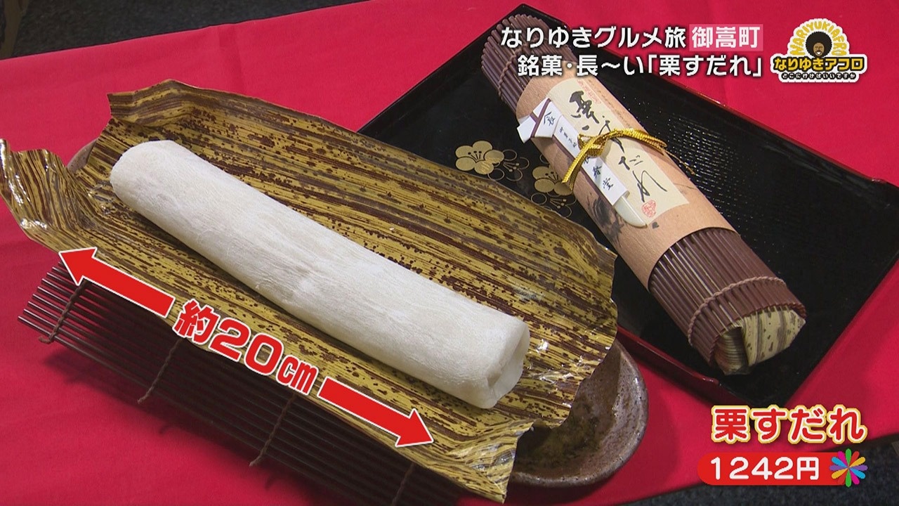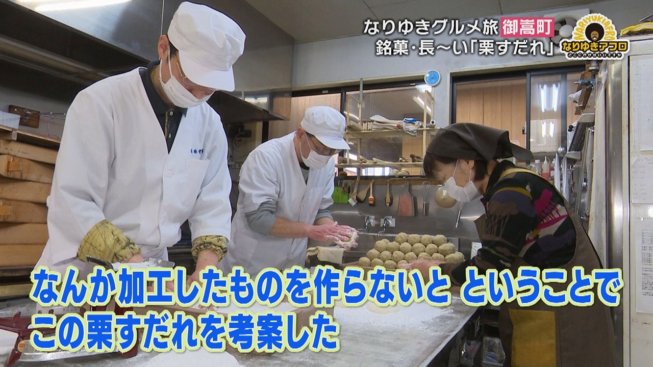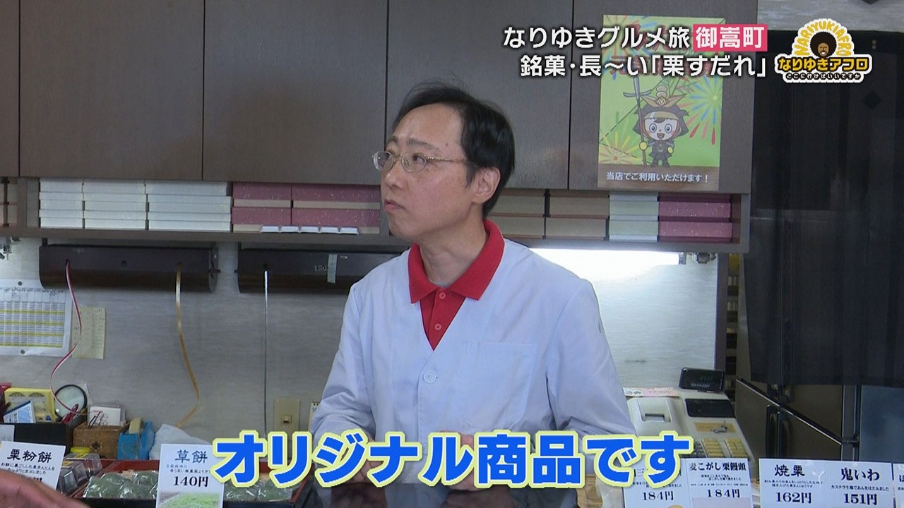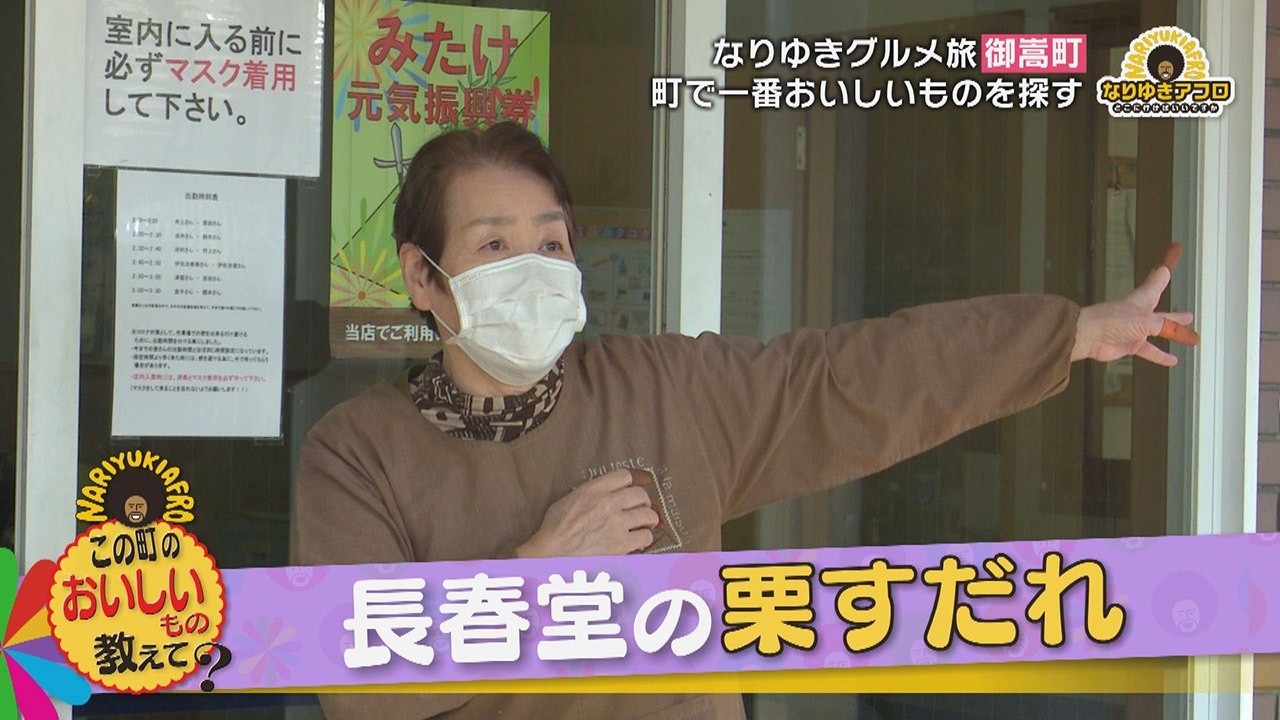 町のおいしいものを聞いたところ教えてくれたのが、『長春堂(ちょうしゅんどう)の栗すだれ』というお菓子。副島くんはすかさず「栗きんとんは聞いたことがあるんですけど、栗すだれってなんですか?」と聞き直すと、「ちょっと長くて、栗きんとんが入っていて、周りをお餅でくるんであるもの」という説明が。