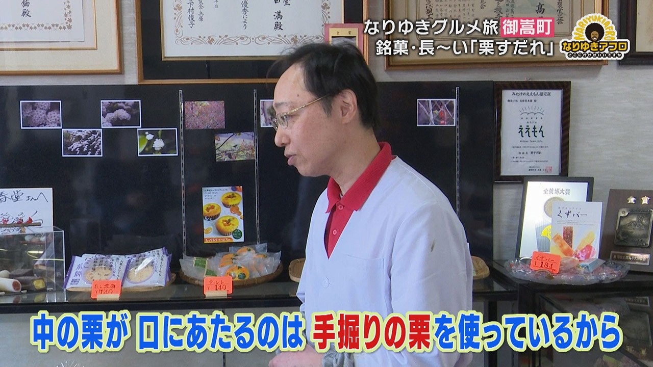 すると「オリジナル商品です。昭和48年の登録になってます」とご主人。『栗すだれ』という名で先代がお菓子の博覧会に出品し、金賞を獲得した賞状が店内に飾られていました。その後、お店の看板商品となったこのお菓子。お初にお目にかかる副島くんは出されたとたん「すごい!長っ!」と、ただただビックリします。
