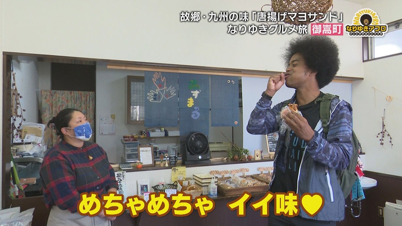 「あーヤバい! めちゃめちゃいい味!」と、甘辛醤油味の唐揚げとマヨネーズ、そして、パンとの相性を絶賛。さらに「パンもいいですけど、この味付けをした唐揚げだけを10個とか持って帰りたいです」と副島くん。実際にお客さんからも同様のリクエストが多いそうで、オーナーさんは「パン屋さんなんですけど…」と苦笑い。でも、しっかりとそのリクエストにも応えている評判のパン屋さんです。
